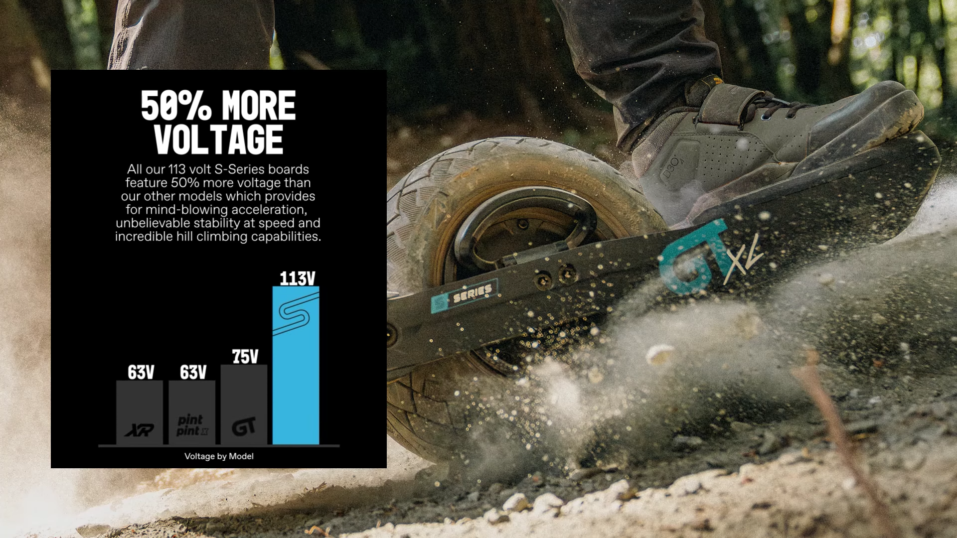 Motor: S-Series Hypercore tuned hub, 113 V powertrain (~50 % more voltage than previous models)